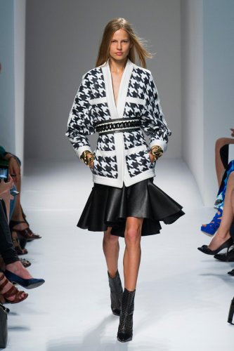 巴尔曼(Balmain)本季采用了许多格纹设计,但是显然他更偏好于千鸟格,尤其是黑白配色千鸟格。各式裙装或裤装千鸟格纹套装简洁又大方,并且有些还加入了运动风格设计,显得更为中性。后面有两件粉红+白和淡蓝+白色千鸟格设计,看起来更具少女气息。