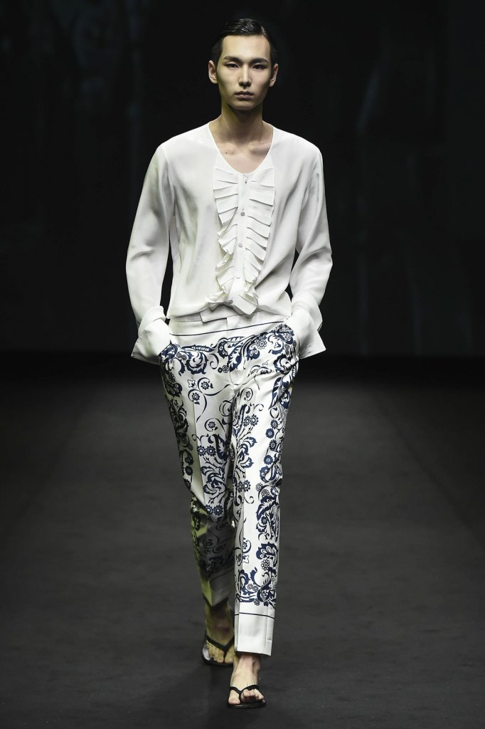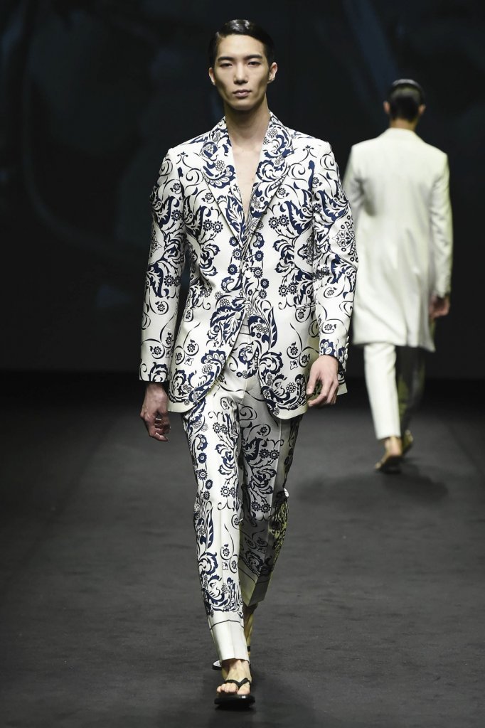 以精心定制男士西装为名的韩国设计师品牌金瑞龙(Kim Seo Ryong),其2017春夏系列推出了另一种新风格的男士西装,融入了华丽的巴洛克风格印花,文艺而复古,充满浓浓的神秘色彩。模特胸前的褶皱花边中和了西装的硬朗,使整体多了几分柔和,颇有宫廷风的感觉。